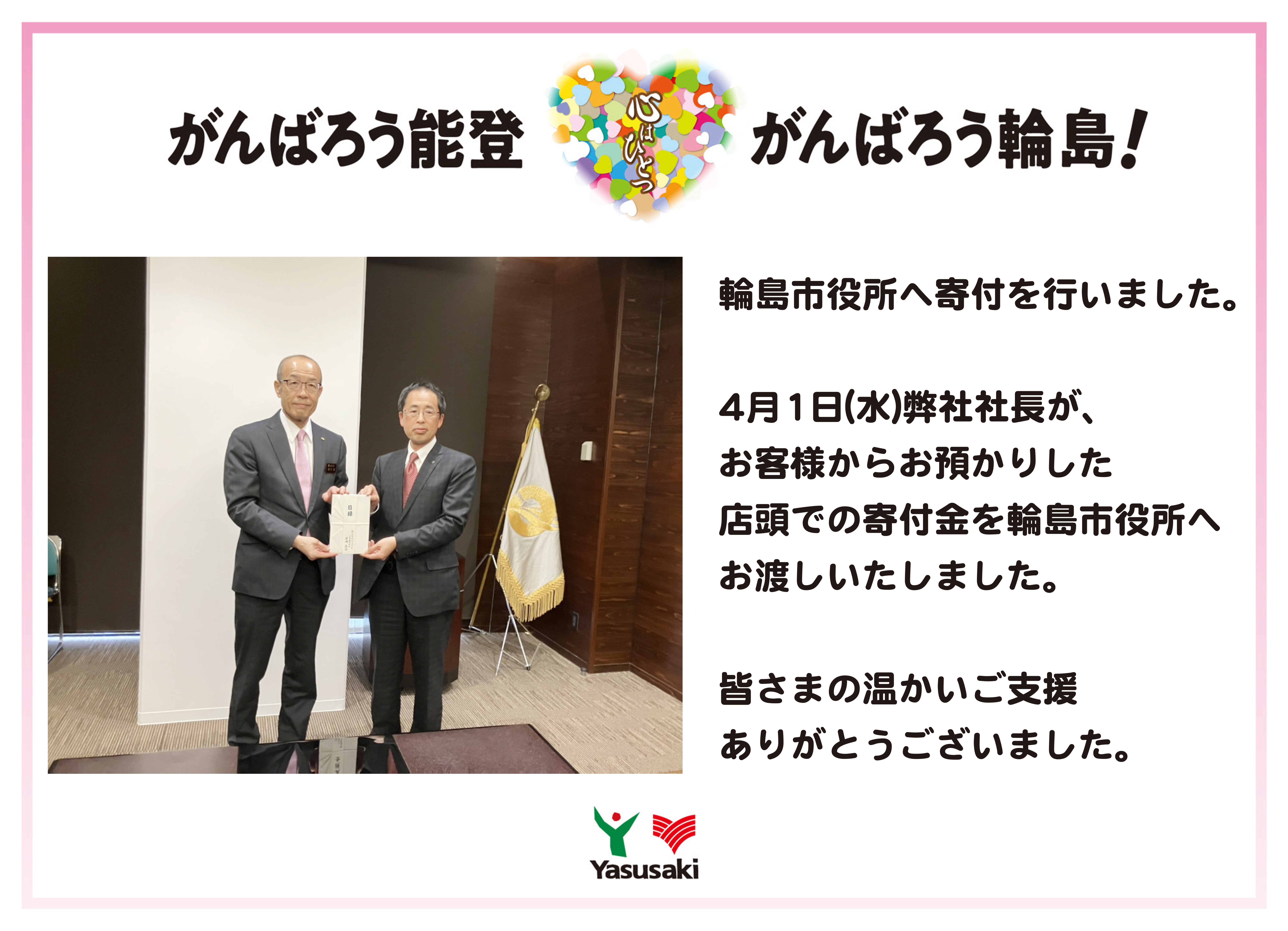4月1日(水)弊社社長が、お客様からお預かりした 店頭での寄付金を輪島市役所へお渡しいたしました。 皆さまの温かいご支援ありがとうございました。