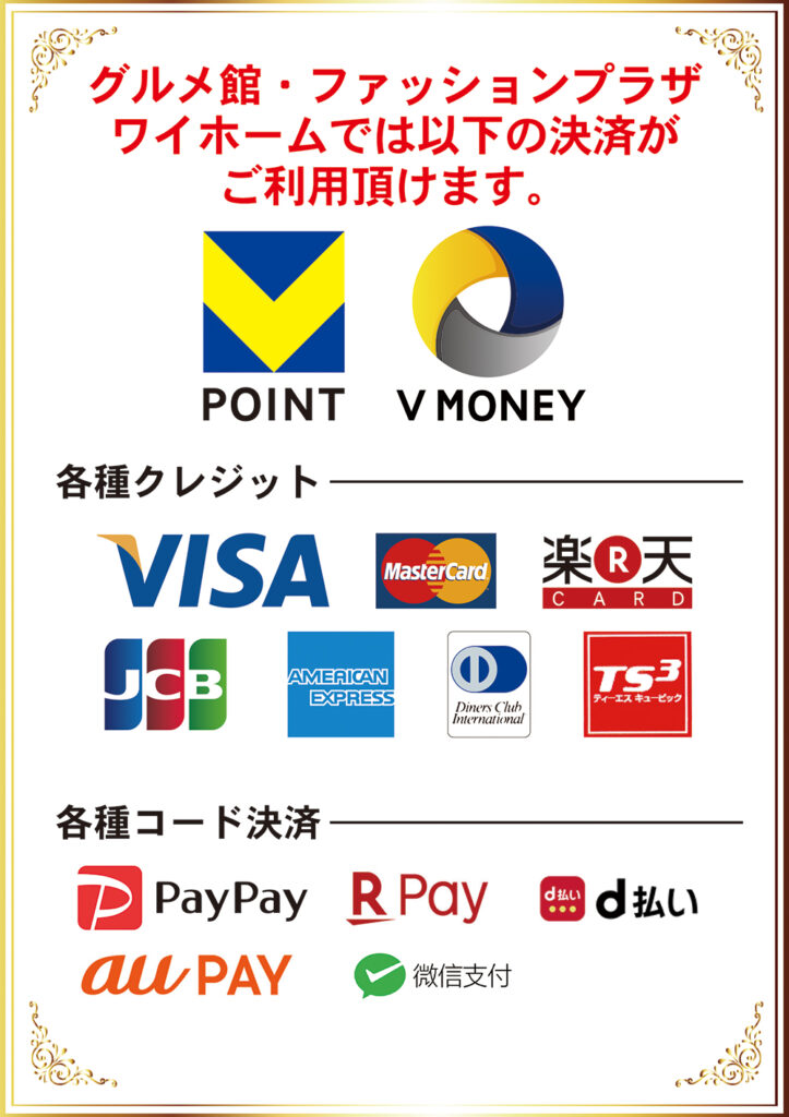 - お客様により快適にお買物していただけるようにグルメ館・ファッションプラザ・ワイホーム各店でのお支払いにVポイント、Vマネー、各種クレジット、各種コード決済がご利用いただけます。